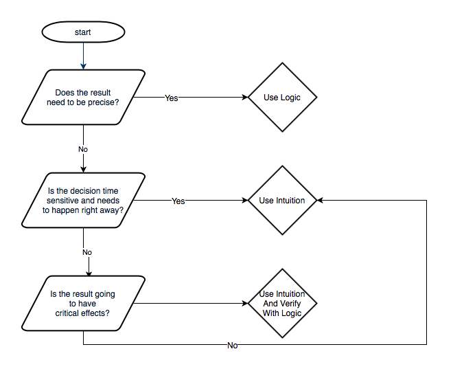 That being said, I have a general rule of thumb in my head that I try to use (I say try because the world is not perfect and you cannot always follow rules in every situation) while making decisions. Take this as a grain of salt because this might not work for everyone (I do not even know if it works properly for myself 😂). I first check if my result needs to be precise or not, if it does I try to use logic. Then I check if the decision is time sensitive and needs to happen right away or not. If it does I go with my intuition. Then I categorize if the end result of my decision is going to have critical effects or not, where critical means if the result can affect anything major or cause any damage if its wrong. If the result needs to be critical, I try to use what my intuition says and then double check that with logic if possible. If it does not need to be critical, I usually go with my instinct and intuition. I have created this little flowchart with my horrible flowchart making skills: