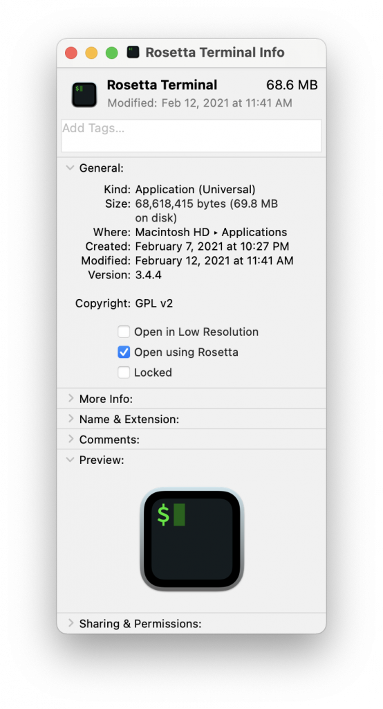 - Right click Rosetta iTerm, and open 'Get Info' option.